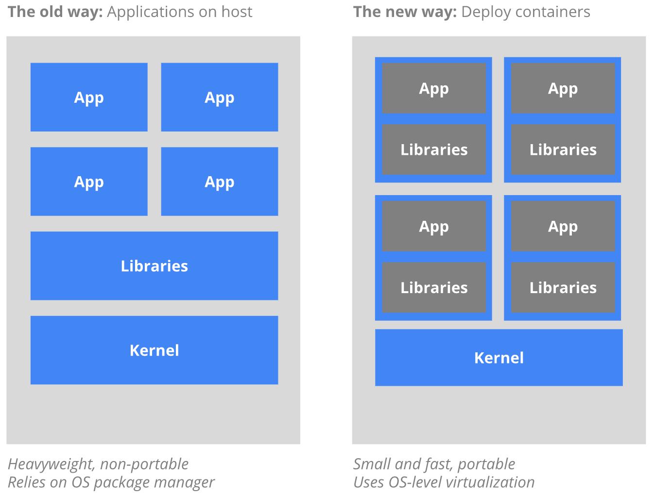 - 传统的应用部署方式是通过插件或脚本来安装应用。这样做的缺点是应用的运行、配置、管理、所有生存周期将与当前操作系统绑定,这样做并不利于应用的升级更新/回滚等操作,当然也可以通过创建虚机的方式来实现某些功能,但是虚拟机非常重,并不利于可移植性。